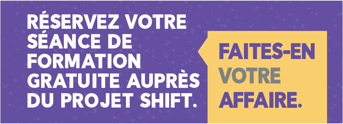 COMMUNIQUEZ AVEC LE PROJET SHIFT POUR RÉSERVER UNE SÉANCE DE FORMATION SUR VOTRE LIEU DE TRAVAIL.